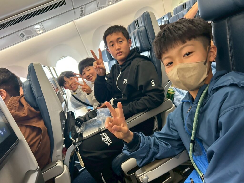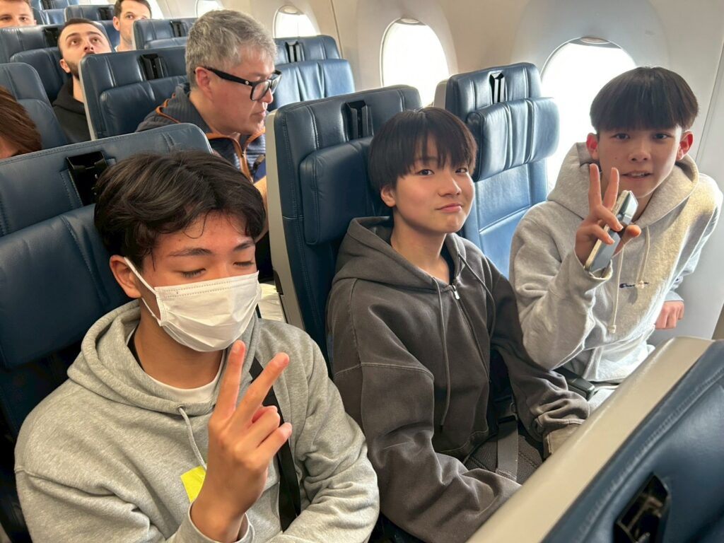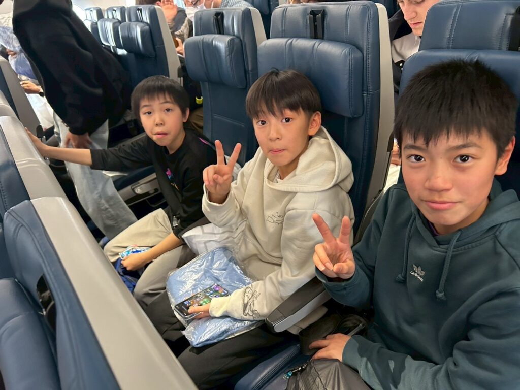 15:45頃に羽田空港を出発し、乗り換え先のデトロイト空港まで約11時間。ツアーに何度か参加している子達は慣れた様子で、初めての子達はワクワクした面持ちで機内を過ごし、INUYAMAの子達はゲームに明け暮れていました。